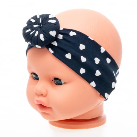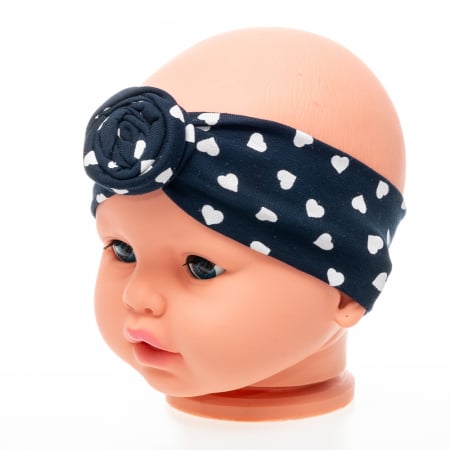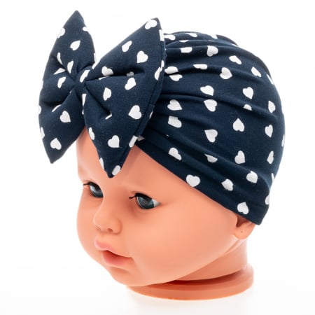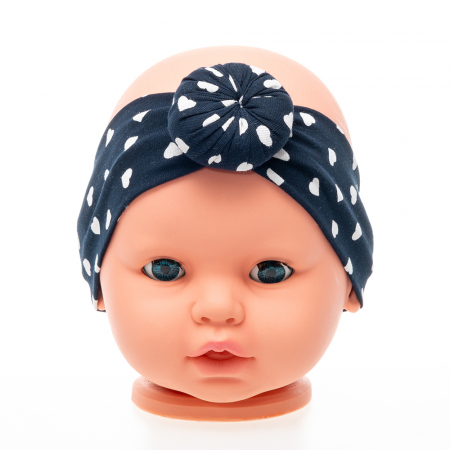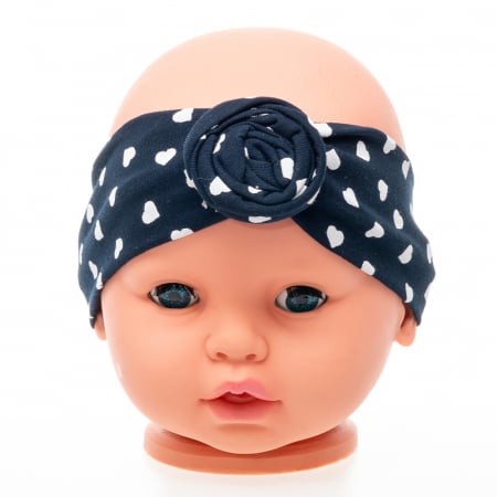 Set 3 piese fete format din turban si 2 bentite, culoare negru cu imprimeu inimioare, albastru inchis.