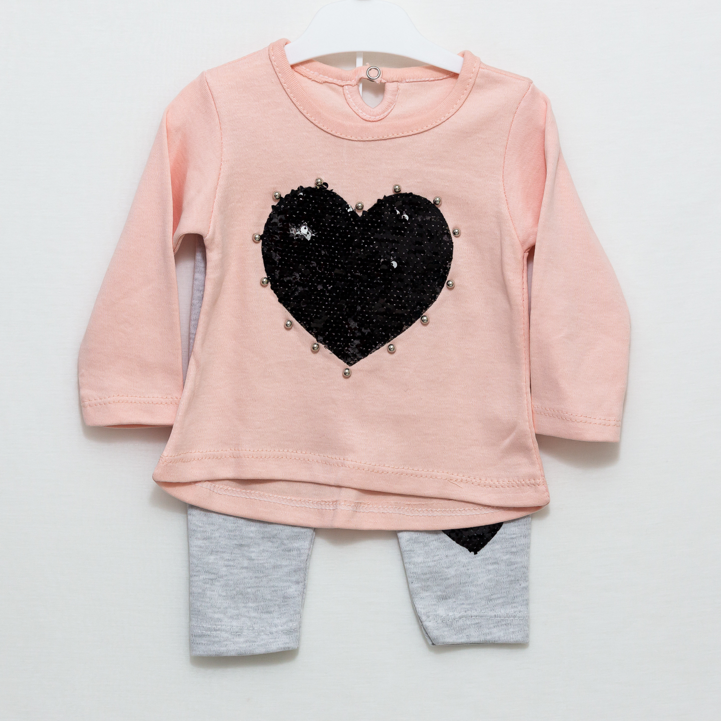 Set 2 piese Inimioara format din: bluzita cu maneca lunga si inchidere cu capsa+pantaloni, material 50% bumbac-50% poliester.