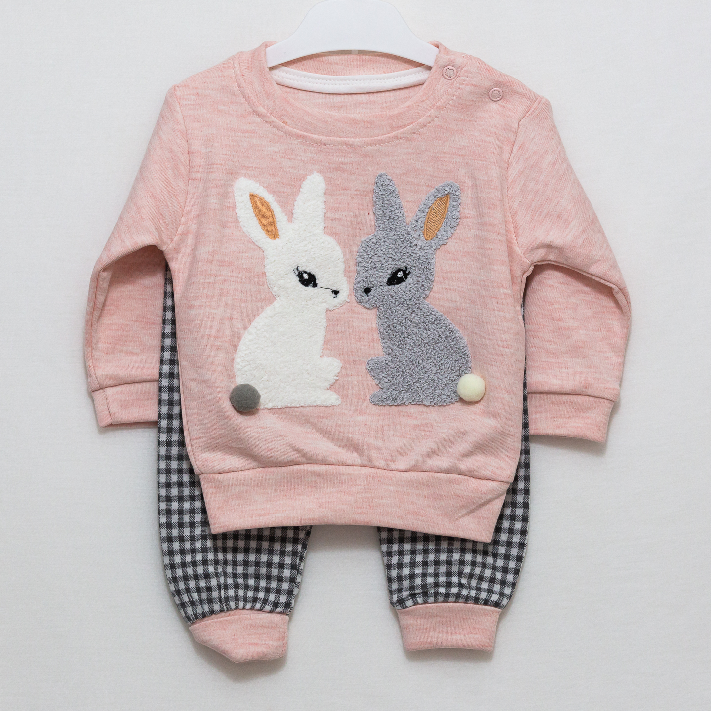 Compleu bebe Bunny format din bluză cu mânecă lungă și închidere cu capse, pantaloni, material moale și plăcut la atingere 95% bumbac-5% elastan.